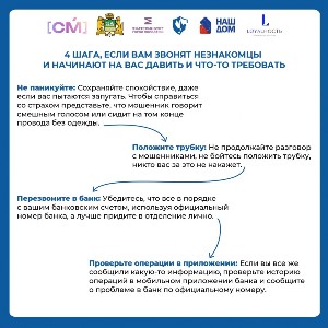 «Прошу запомнить основные методы, которыми пользуются преступники. Вам могут позвонить и сообщить, что кто-то из родных совершил ДТП. А для того, чтобы избежать тюрьмы, потребуют крупную сумму денег. Свяжитесь с близкими и проверьте насколько эта информация соответствует действительности. Вам могут сказать, что необходимо снять порчу. Старая, но по-прежнему действующая схема обмана. Возможно запугивание взломом вашего банковского счета, проведением «подозрительных операций» с ним, оформлением кредита без ведома владельца счета. Могут попросить продиктовать по телефону реквизиты банковской карты, пин-коды из смс сообщений, CVV коды с обратной стороны карты. Могут напугать «компьютерной атакой» на телефон, предложить установить специальное приложение для защиты.